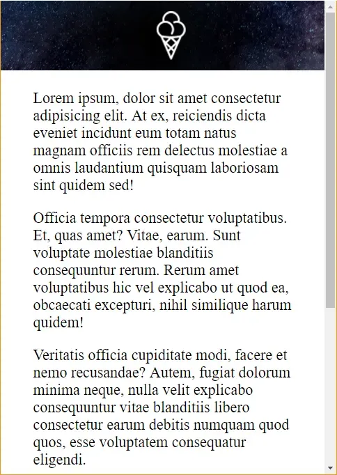 The header is cut off. On extra small devices like this (portrait phones) with a max width of 576 pixels, it might be nice to just show the ice cream logo. To do that, I create a smaller header image with only the logo. This image is 576 x 100 pixels.