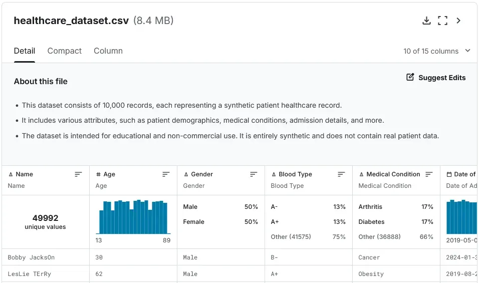 Feel free to explore this file to get a sense of what data it contains. You will notice it has columns for things like age, gender, medical condition, test results, and more.